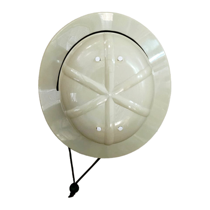 Le chapeau explorateur est en plastique rigide, avec cerclage en plastique à l'interieur pour régler la taille du chapeau. Une ficelle noire se trouve autour du chapeau et se règle au niveau de la taille sous le menton.