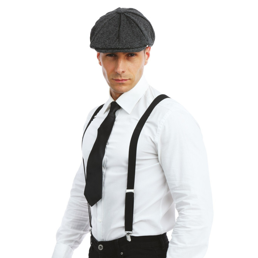 Le set se compose d'une casquette grise en taille homme, élastiquée à l'arrière, de bretelles réglables et d'une cravate.