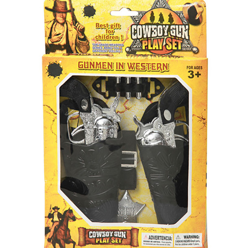 Set de cowboy enfant comprenant : deux pistolets de cowboy en plastique, deux sacoches porte-pistolets, une ceinture et une insigne de shérif en plastique.